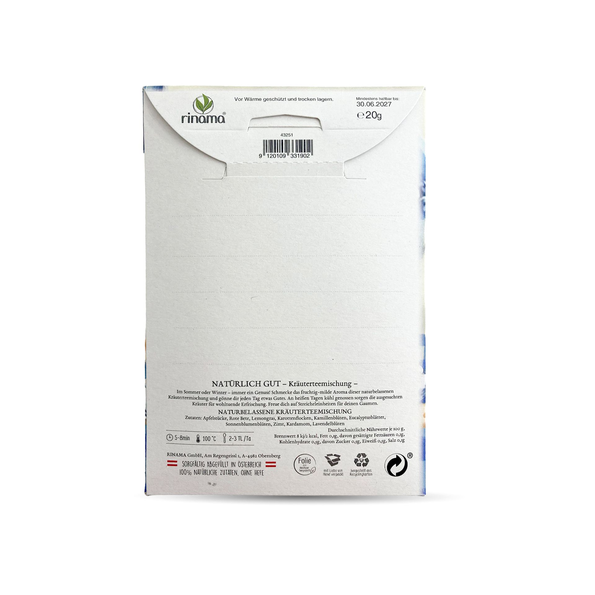 Im Sommer oder Winter — immer ein Genuss! Schmecke das fruchtig-milde Aroma dieser naturbelassenen Kräuterteemischung und gönne dir jeden Tag etwas Gutes, Inhalt: "Natürlich Gut" Kräuterteemischung, Zutaten: Apfelstücke, Rote Bete, Lemongras, Karottenflocken, Kamillenblüten, Eucalyptusblätter, Sonnenblumenblüten, Zimt, Kardamom, Lavendelblüten, 20 g