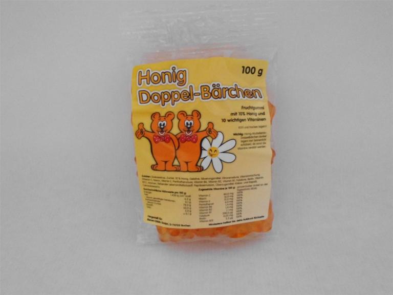 Honig-Doppelbärchen (Gummibärchen) mit 10% Honig und 10 wichtigen Vitaminen, ohne künstliche Farb- und Konservierungsstoffe. Zutaten: Glukosesirup, Zucker, 10% Honig, Gelatine, Säuerungsmittel; Zitronensäure, Vitaminmischung (Vitamin C, Niacin, Vitamin E, Panthothensäure, Vitamin B6, Vitamin B2, Vitamin B1, Folsäure, Biotin, Vitamin B12) Aromen, färbender Lebensmittelfarbstoff: Paprikaemulsion. Durchschnittliche Nährwerte pro 100 g: Energie: 1.430 kj / 337 kcal