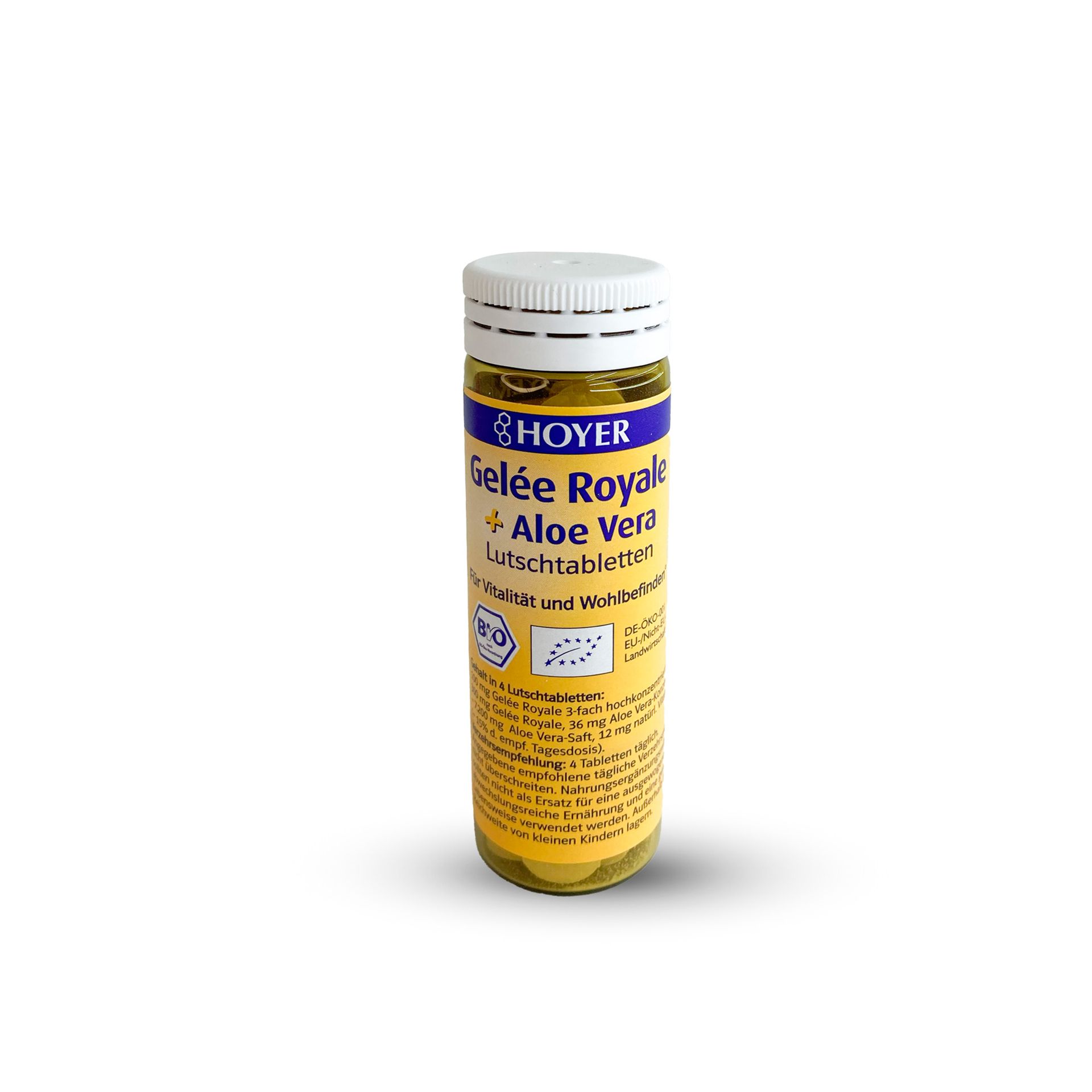 60 Tabletten, 30 g HOYER Gelée Royale + Aloe Vera Tabletten kombinieren Gelée Royale, Nährstoff der Bienenkönigin, mit den vielfältigen Eigenschaften der mythenumwobenen Pflanze Aloe Vera in wohlschmeckenden Kautabletten. Kombiniert mit Vitamin C aus der Acerolakirsche entsteht so eine wertvolle Nahrungsergänzung natürlicher Substanzen. Gelée Royale dient der Ernährung der Bienen-königin und verleiht ihr die Fähigkeit, täglich bis zu 2.000 Eier zu legen und dennoch als Einzige 50 mal länger als ihre Artgenossinnen zu leben. Gelée Royale ist besonders kostbar, weil es vom Imker nur in sehr geringen Mengen aus dem Bienenstock entnommen werden kann. Alle Versuche, Gelée Royale künstlich im Labor nachzuahmen, scheiterten bisher, da bis heute viele der Inhaltsstoffe immer noch nicht analytisch erfassbar sind. Ohne künstliche Aroma-, Farb- und Süßstoffe*. *lt. Öko-Verordnung