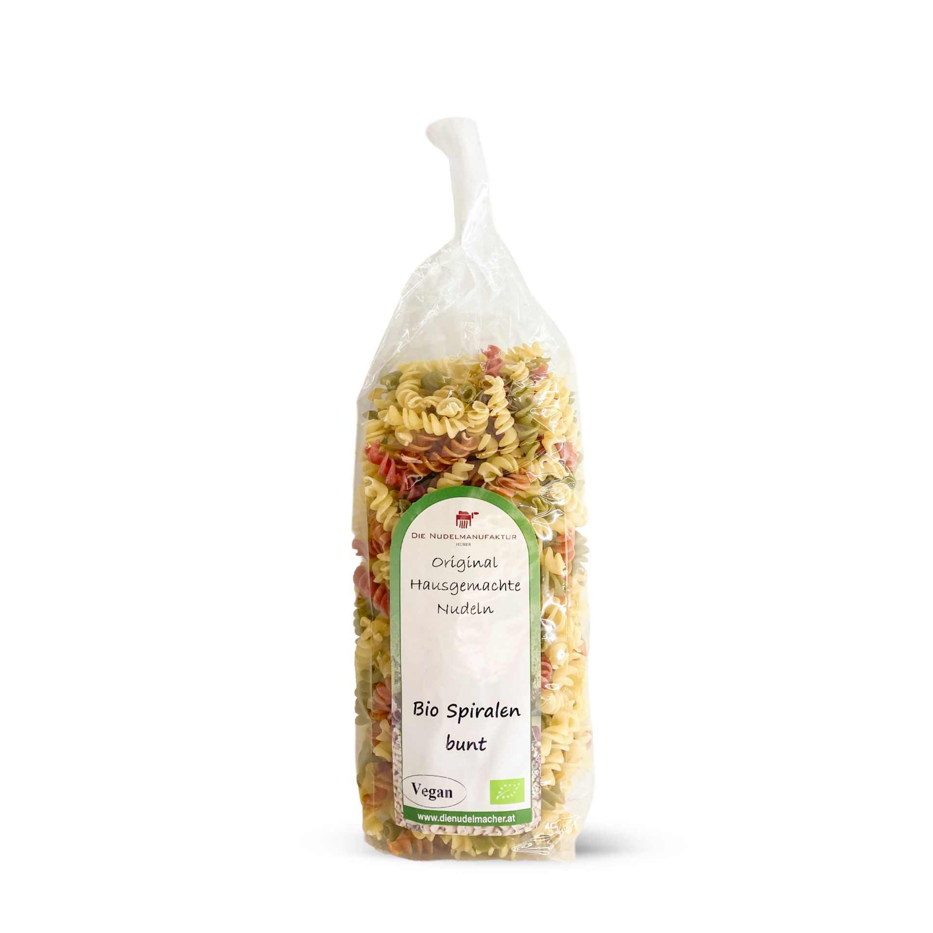 Spiralen-Nudeln werden gerne für Nudelsalate, Eintöpfe und Aufläufe verwendet, passen aber auch sehr gut zu Soßen oder als Beilage zu Fisch- und Fleischgerichten. Unsere bunten Spiralen gehören zu den Klassikern unter den Nudeln und machen jedes Gericht zu etwas besonderem, vor allem Kinder sind von den bunten Nudeln begeistert. Da bei diesen Nudeln keine Eier verarbeitet wurden, finden sie auch in der veganen Küche ihren Platz. Sorgfältig hergestellt aus Bio-Hartweizengrieß, Wasser und Bio Hartweizen. Gefärbt werden die grünen Nudeln mit Bio Spinat und die Roten mit Bio Tomate/Rote Beete. Kann Spuren von Ei enthalten! Unsere Teigwaren sind frei von Zusatz- und Konservierungsstoffen.