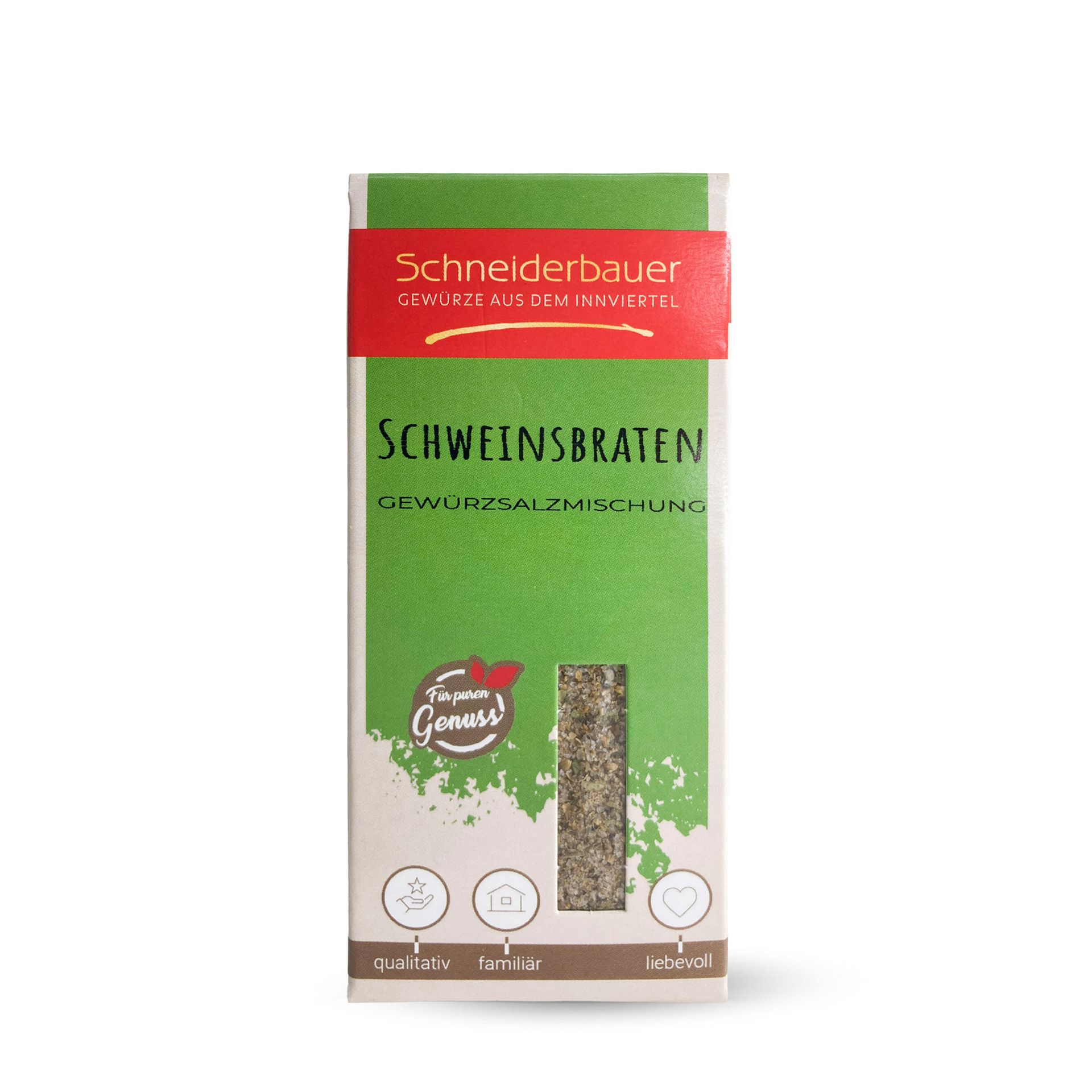 Die Mischung aus fein- und grobgemahlenen Gewürzen verleiht dem Schweinsbraten einen deftig würzigen Geschmack. Das Schweinsbratengewürz wird vorallem – wie im Innviertel bekannt ist – zum siaßn Bratl verwendet. Unsere Gewürzmischung wird ohne Konservierungsstoffe und ohne Geschmacksverstärker hergestellt.