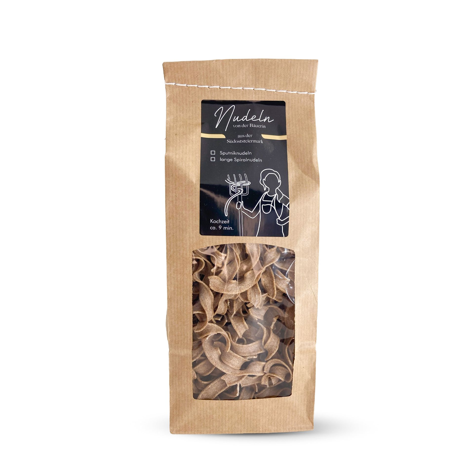 Nudeln aus dem eigene Weizengrieß vom Prutsch-Hof aus der Südoststeiermark. Die Nudeln haben ein schönes mattes braun - das liegt daran, dass sie mit dem eigenen Weizengrieß produziert worden sind. In diesem Grieß sind viele Nährstoffe enthalten, die auch für die Farbgebung verantwortlich sind!